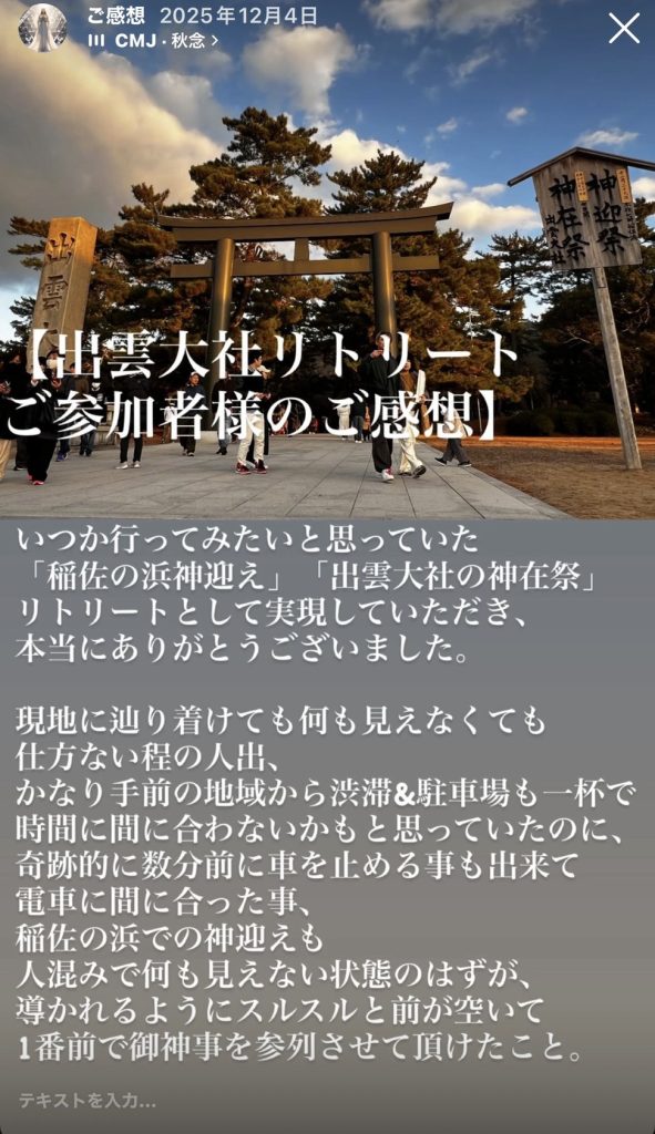 いつか行ってみたいと思っていた 「稲佐の浜神迎え」「出雲大社の神在祭」 リトリートとして実現していただき、 本当にありがとうございました。