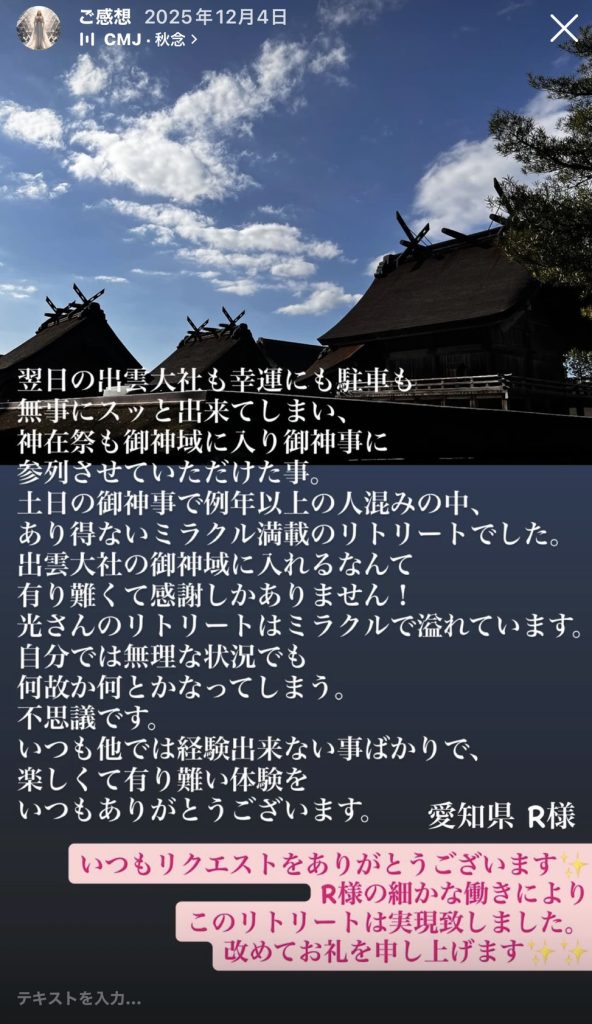 翌日の出雲大社も幸運にも駐車も 無事にスッっと出来てしまい、 神在祭も御神域に入り御神事に 参列させていただけた事。 土日の御神事で例年以上の人混みの中、 あり得ないミラクル満載のリトリートでした。 出雲大社の御神域に入れるなんて 有り難くて感謝しかありません! 光さんのリトリートはミラクルで溢れています。 自分では無理な状況でも 何故か何とかなってしまう。 不思議です。 いつも他では経験出来ない事ばかりで、 楽しくて有り難い体験を いつもありがとうございます。
