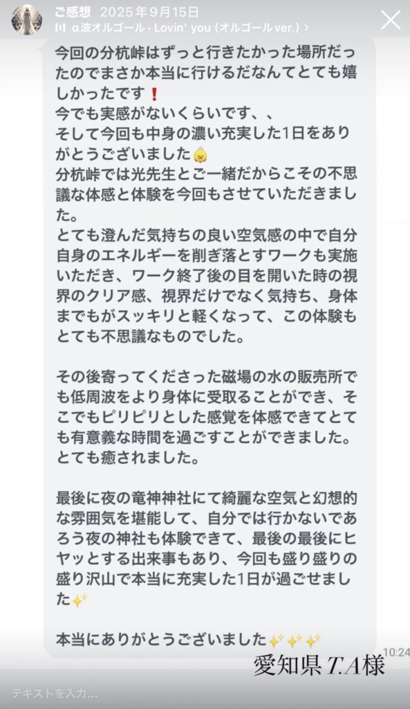その後寄ってくださった磁場の水の販売所で も低周波をより身体に受取ることができ、そ こでもピリピリとした感覚を体感できてとて も有意義な時間を過ごすことができました。 とても癒されました。